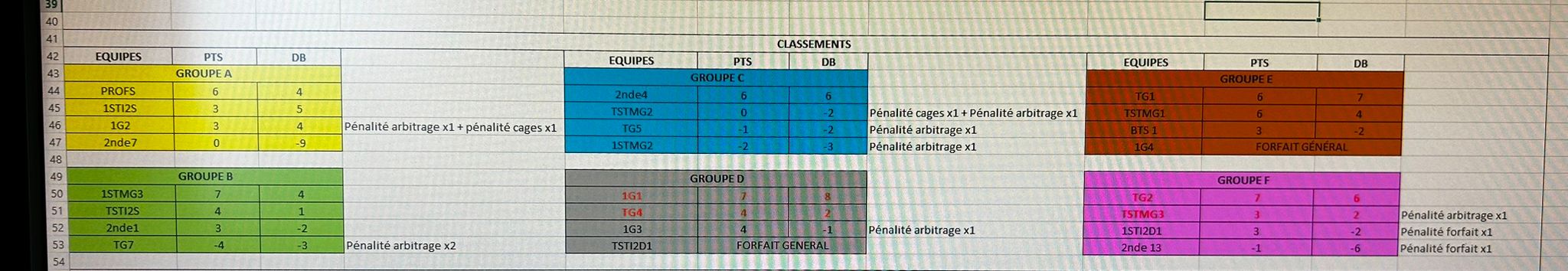 Au classement de la poule , les 1G2 sont actuellement 3ème avec 3 points, juste derrière les 1STI2S qui les devancent à la différence de buts, les profs restant en tête avec 6 points avant la finale de la poule Profs-1STI2S qui aura lieu à la rentrée des vacances. A ce jour, les 1G2 ne sont pas certains de faire partie des quatre meilleurs troisièmes qui seront qualifiés pour les huitièmes de finale. La seconde 7 termine quatrième et dernière de la poule et est définitivement éliminée du tournoi. On peut cependant les féliciter pour n'avoir jamais baissé les bras, avoir toujours joué avec fair-play et n'avoir aucune pénalité au classement.