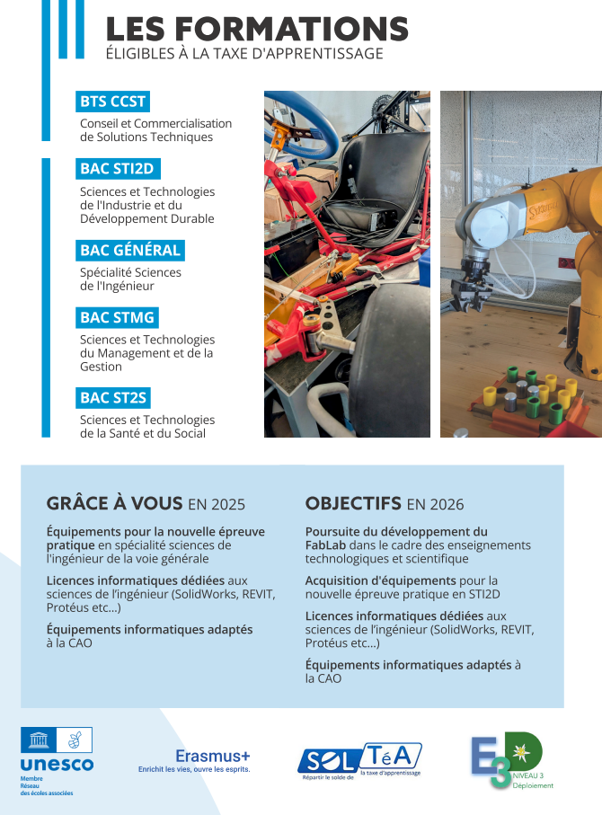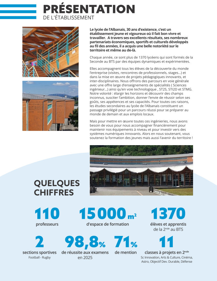 Nous vous proposons donc de soutenir nos projets d’investissement en ciblant le LYCEE DE L’ALBANAIS comme bénéficiaire de votre versement de taxe d’apprentissage en 2026 (salaires 2025).